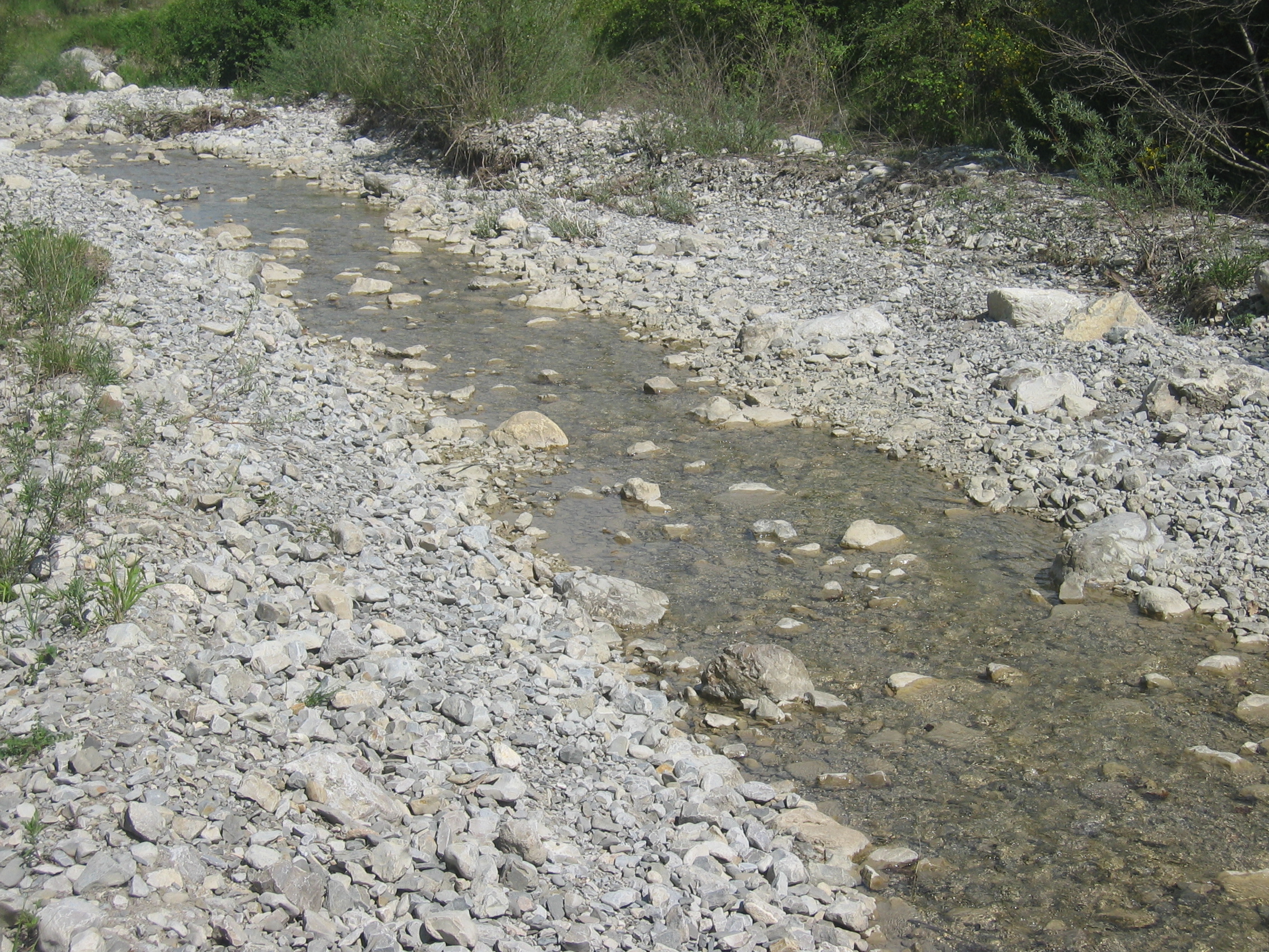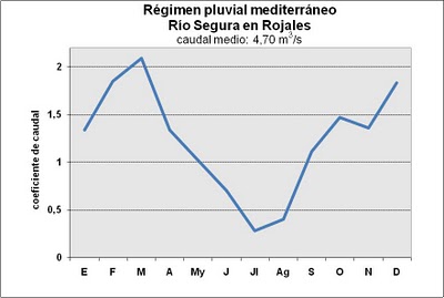 b. Régimen pluvial mediterráneo: sigue la estacionalidad de las lluvias en la zona de clima mediterráneo. Puede tener su caudal máximo en primavera, otoño o invierno, dependiendo de la zona, y el estiaje del verano es muy marcado, que, en algunos casos, puede llevar a secar el río. Un rasgo importante de este régimen es la gran irregularidad. Los meses de máximo caudal suelen superar el doble del caudal medio anual. En España, este es el caudal propio de los ríos de la vertiente mediterránea y en la mayor parte de los ríos de la vertiente atlántica.