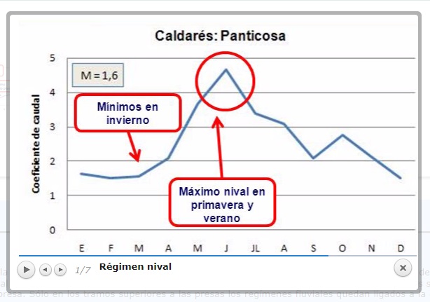 b. Los ríos de régimen fluvial nivo-pluvial dependen, en primer lugar, de las nieves caídas, y en segundo de las lluvias. Tienen dos máximos uno, el mayor, en primavera, con el deshielo, y otro en otoño, con la vuelta de las lluvias, y dos mínimos, un estiaje auténtico en verano y otro de menor entidad en invierno.