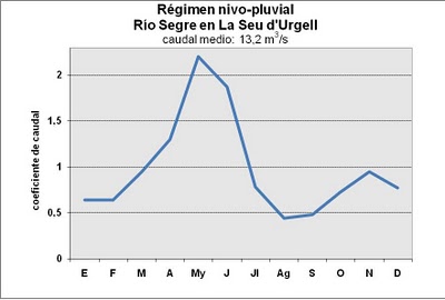 Figura 11 j. Hidrograma régimen fluvial nivo-pluvial | Figura 11 k. Tramo alto río Segre (Lérida) |