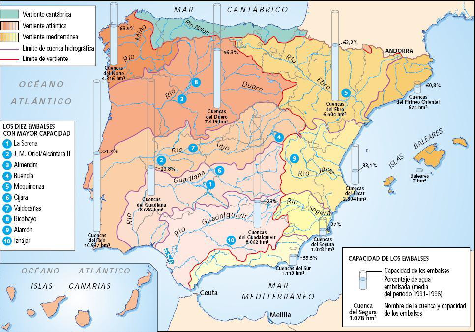 - La irregular distribución de los recursos. Los ríos, que constituyen la principal fuente de abastecimiento, presentan una fuerte irregularidad estacional e interanual y una desigual distribución espacial. En la vertiente cantábrica, además de contar con precipitaciones que superan los 1000 mm anuales, un 55% de ellas alcanza la red fluvial. Sin embargo, en el sur (Guadiana, Guadalquivir, Júcar, Segura), donde las precipitaciones son mucho menores, el 80% del agua precipitada no llega a los ríos. En las cuencas del Duero, del Ebro y del Tajo, la situación es intermedia, ya que las pérdidas oscilan entre el 60 y el 70%. Este hecho determina la presencia de cuencas con claros excedentes (Norte, Duero, Tajo y Ebro), cuencas con equilibrio entre recursos y demanda (las demás cuencas atlánticas y la del Pirineo Oriental) y cuencas con déficits evidentes (las restantes cuencas mediterráneas). El agua procedente de los acuíferos, de la desalinización marina y de la reutilización de las aguas depuradas representa un volumen mucho menor.