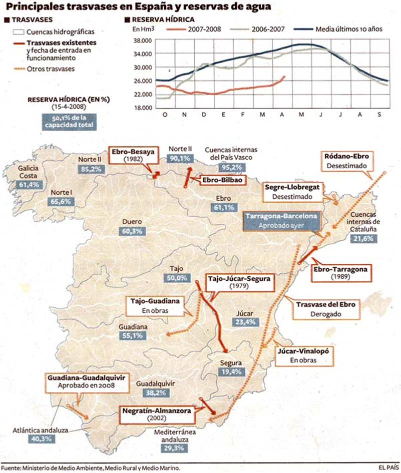 - Canales y trasvases. Política encaminada a trasvasar agua de las cuencas que poseen superávit a las de déficit (trasvases Tajo-Júcar-Segura, o el proyecto derogado del trasvase del agua del río Ebro desde Cataluña al Levante y que generó y genera una fuerte polémica y oposición política y social en las Comunidades afectadas de las que se quería detraer aguas)