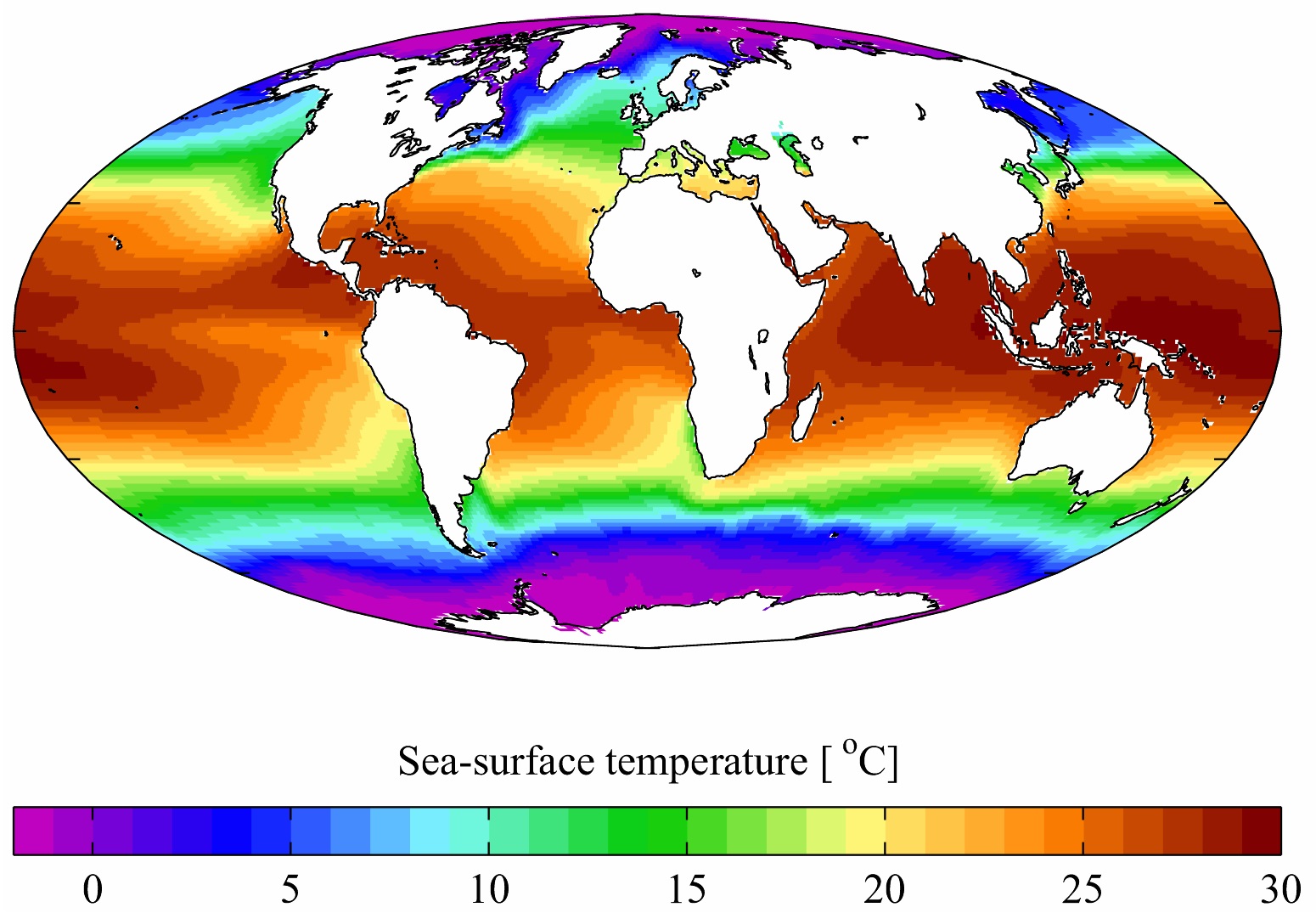 - Temperatura: El agua del mar tiene un calor específico mayor que casi el de todos los sólidos y líquidos, capacidad que se ve favorecida por su transparencia, que hace que los rayos del Sol afecten a una capa más espesa (calculada entre los 100 y 200 m frente a unos 20 m en la tierra), por su movilidad, que transmite la temperatura a mayor profundidad y extensión, y por su albedo, que le permite retener más el calor que recibe, en relación con el que retiene la tierra. De esta forma, el mar se caliente más lentamente en verano y se enfríe mucho más lentamente en invierno que la tierra. Este comportamiento del agua marina se ve reflejada en las corrientes oceánicas que llevan mucha energía térmica. La temperatura del agua de los océanos varía en función de la latitud y de la profundidad. Así, hasta unos 100 m de profundidad, la temperatura se mantiene más o menos constante, pero a partir de esos 100 metros baja acusadamente hasta los 1000 m (termoclina), que se extiende la zona de agua profunda o zona abisal, en la que la temperatura permanece prácticamente constante entre 1 y 3º C.