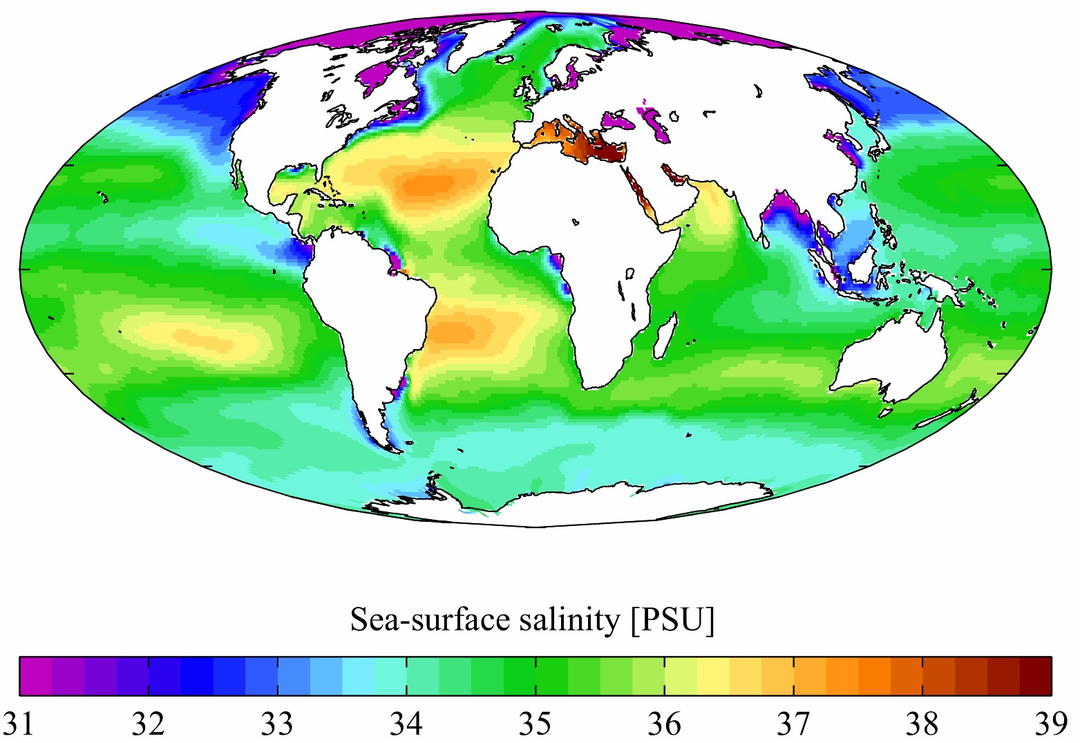 - Salinidad: Es la cantidad total de material disuelto en gramos en un kilogramo de agua de mar. Varía muy poco, en la mayor parte de los océanos la variabilidad es entre 34,6 a 34,8 partes por mil (‰). Los componentes que se encuentran disueltos son en su mayoría procedentes del cloruro sódico, sal, (∼ 85 %) y pequeñas cantidades de cloruro magnésico, sulfato de magnesio y carbonato cálcico. Aunque la salinidad varía de un océano a otro, las fracciones relativas de estos componentes son constantes independientemente de la salinidad total, lo que indica que los océanos se encuentran bien mezclados. La salinidad también varía en relación a la profundidad, siendo más alta en la superficie debido a la alta evaporación que tiene lugar y desciende hasta una profundidad de 1000 metros. Después aumenta levemente a medida que aumenta la profundidad. La salinidad también varía con la latitud. Las aguas más saladas están en las latitudes medias donde la evaporación es alta y las aguas menos saladas se encuentran cerca del ecuador, donde el agua de la lluvia diluye el agua salada, y en las latitudes altas donde se funde el hielo diluyendo también el agua salada de la superficie. A pesar de que muchos grandes ríos tienen su desembocadura en el océano Atlántico y en el océano Ártico, el agua del Atlántico es más salada que la del Pacífico. Una explicación de este hecho es que parte del agua evaporada en el Atlántico se transporta por el viento hasta el Pacífico donde cae en forma de lluvia.