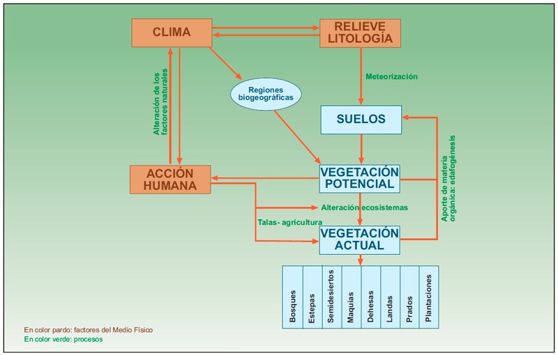 - Clima: ya vimos en su momento que los climas terrestres presentan una distribución zonal que, dada la dependencia de las plantas respecto a ellos, determina una disposición similar de los grandes conjuntos biológicos o biomas. Las grandes franjas de clima y vegetación coinciden espacialmente y la comprensión de éstas últimas requiere un buen conocimiento de las primeras. A escala regional, cuando determinados factores geográficos distorsionan la zonalidad de los climas, el manto vegetal lo refleja inmediatamente. Son, por ejemplo, los microclimas en áreas de montaña, las zonas costeras, etc...