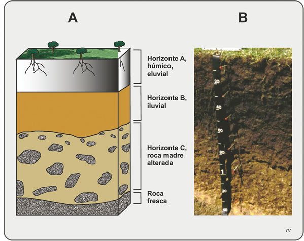 Los suelos están formados por horizontes, que son capas individualizadas por sus rasgos físicos, químicos y biológicos. El conjunto de horizontes se llama perfil. En profundidad se encuentran los horizontes D (roca madre) y C (roca madre alterada). En superficie se encuentra el horizonte A que tiene una capa A0, formada por la hojarasca; una capa A1, oscura, formada por humus o materia orgánica en descomposición; y una capa A2, más clara que es una zona de lixiviación o de pérdida de sustancias que son arrastradas por las precipitaciones a las capas inferiores. Entre ambos se sitúa el horizonte B de color más intenso, que tiene una capa de alteración en contacto con el horizonte C y una capa de acumulación de sustancias lixiviadas del horizonte A.