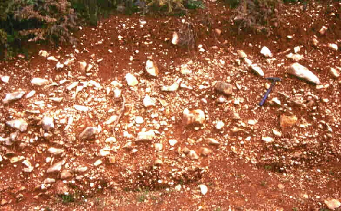 En el roquedo calizo, los suelos tienen un horizonte arcilloso por la disolución de la caliza y color rojizo por el óxido de hierro. Hay dos tipos: el suelo rojo mediterráneo, excelente para todo tipo de cultivos y la terra rossa que al estar sobre la roca madre es frecuente que aflore ésta, dificultando la mecanización, por ello, suele dedicarse a matorrales o bosques adehesados y cultivos arbóreos como olivo y almendro.