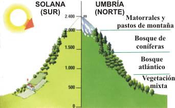 Aspectos relacionados con el relieve como la orientación de las laderas (solana-umbría) condicionan la temperatura o la humedad, por lo que determinan la presencia de especies higrófilas (en umbría) o xerófilas (solana). Pero también la altura determina la aparición de diferentes tipos de vegetación adaptada a la bajada de temperatura con la altura, originando un escalonamiento de la vegetación denominado pisos bioclimáticos.