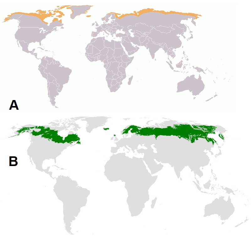 Figura 6. Extensión de tundra (A) y la taiga (B). |