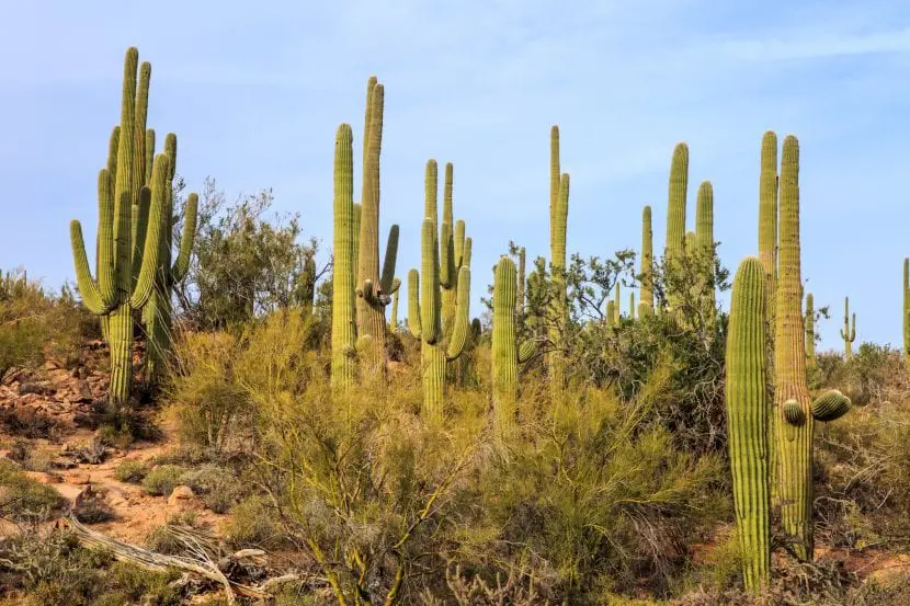 c) Desiertos de América del Norte: a diferencia de los demás, estos desiertos presentan una importante biomasa y constituyen ecosistemas complejos y diversificados. Aparecen especies como el sahuaro (Carnegia gigantea), el árbol de Josué (Yucca brevifolia) y otras cactáceas así como numerosas efímeras, matorrales xerofíticos así como plantas esclerófilas e incluso, en los nichos más favorables, algunos arbolitos muy especializados, helechos y líquenes.