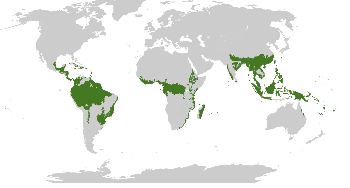 La pluvisilva ecuatorial se localiza en una franja que circunda la tierra coincidiendo más o menos con el Ecuador y que alcanza latitudes variables dependiendo de los continentes. Las mayores extensiones se encuentran en América Central y del Sur (cuencas del Amazonas y del Orinoco), África (cuenca del Congo y países costeros del golfo de Guinea), Sudeste de Asia (Indonesia…) y algunas áreas de Oceanía. Se incluyen también en esta categoría los bosques húmedos monzónicos del Sur y Sudeste asiático, muy parecidos a los primeros.