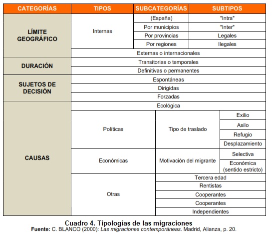 Establecer una clasificación de los movimientos migratorios es bastante complejo dada la amplia variedad de situaciones que se pueden recoger (tipo, límites, sujetos, duración o causas).Las clasificaciones más habituales serían: