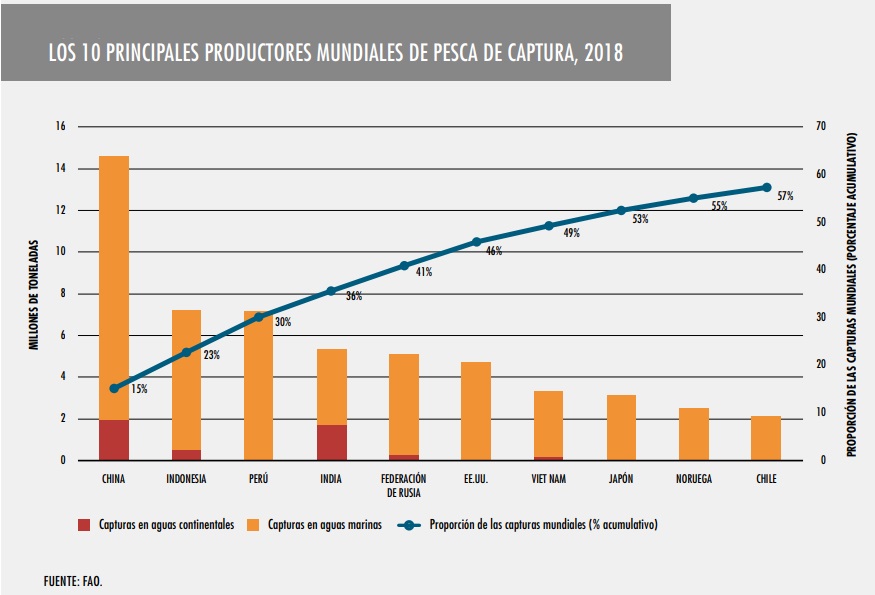 En 2020, China fue el mayor productor pesquero con diferencia. El país representaba el 15% de las capturas mundiales y el 57% de la producción acuícola, mientras que toda Asia (Japón, Indonesia, Vietnam o India, principalmente) representaba el 84% de los casi 60 millones de puestos de trabajo en la pesca y la acuicultura en todo el mundo. Le sigue América (Perú, Chile, EEUU) y Europa (Noruega, España, Francia).
