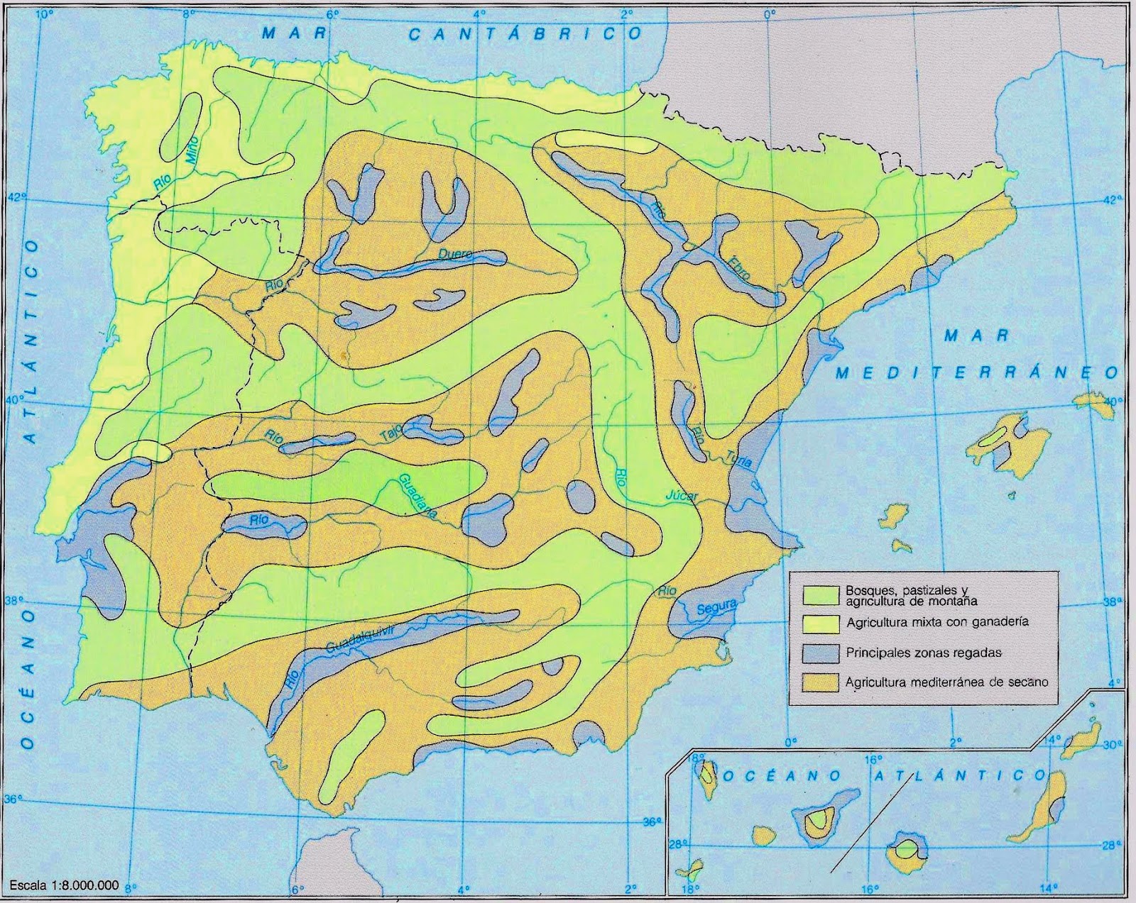 c) Explique brevemente los factores físicos (clima, relieve, litología) que influyen en cada uno de los dominios agrarios representados en el mapa. (Hasta 2 puntos)