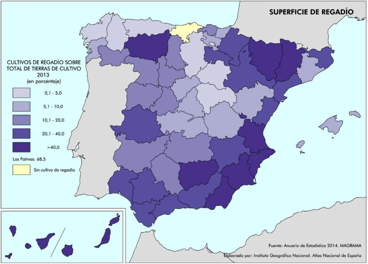 A continuación se reproduce un mapa de España con expresión de las superficies de regadío. A partir del mismo, responda a las siguientes cuestiones: