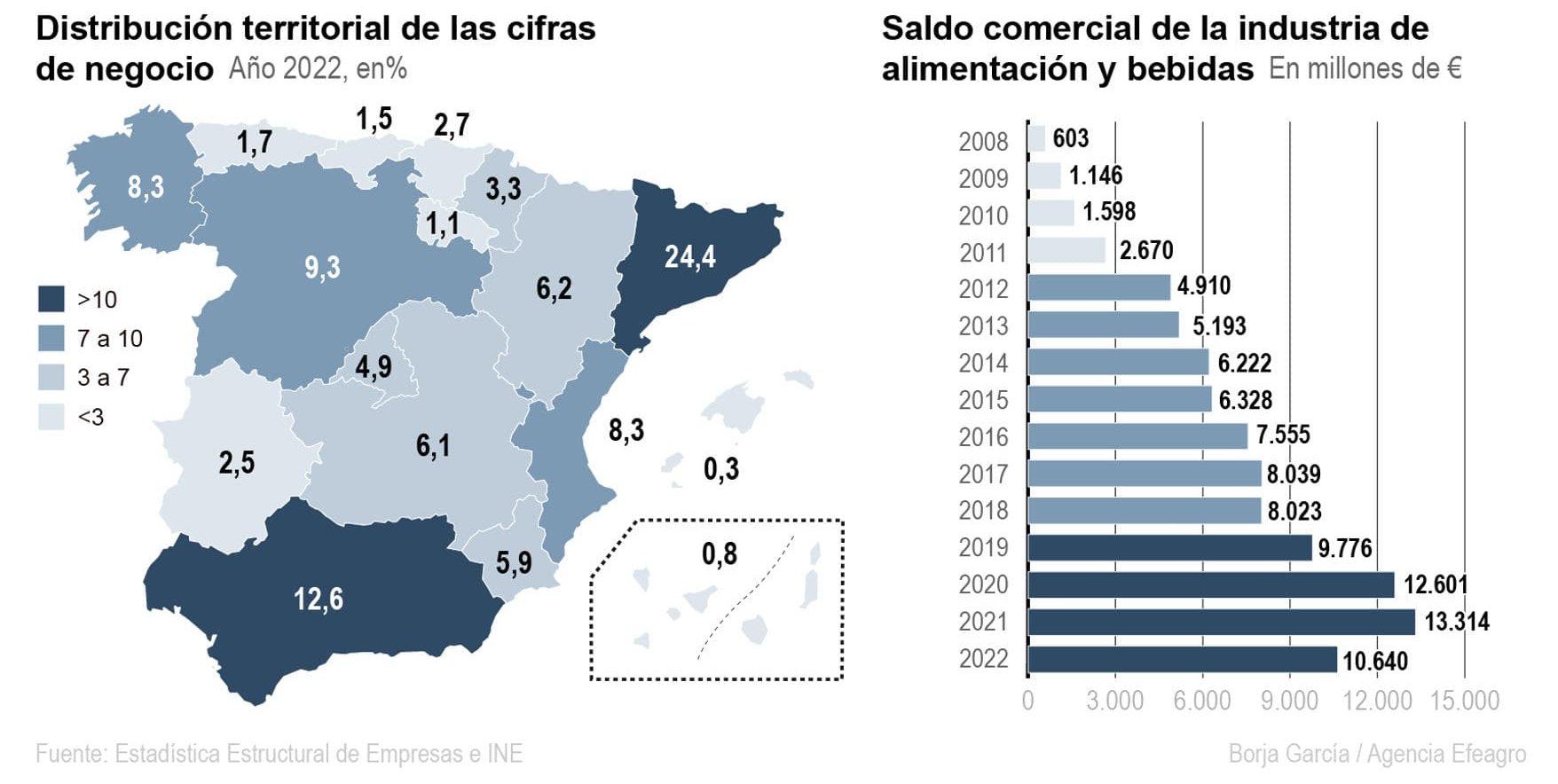 El sector agroalimentario ha irrumpido con fuerza en las sociedades modernas. Consiste en un proceso de transformación de los productos agrarios impuesto por la disociación entre zonas productoras y consumidoras. Es un sector que se caracteriza por la diversidad en cuanto a la naturaleza de los productos, los procesos de transformación, la estructura empresarial, la distribución geográfica de las fábricas, etc. En general, predominan las fábricas pequeñas y medianas, de carácter familiar, pero también conviven sociedades anónimas, cooperativas y sociedades agrarias de transformación. La localización es diversa; coinciden en regiones productoras de las materias primas (conservas hortícolas, lácteos), preferentemente con áreas de regadío, en las proximidades de grandes ciudades (cerveza), en las proximidades de los puertos pesqueros (conservas de pescado), etc. También se han establecido grandes empresas multinacionales, cuya presencia podría ser muy importante en ramas como la de los derivados lácteos, la del aceite, la del azúcar, etc. Supone el 23% del producto bruto industrial, con una facturación próxima a los 140.000 millones de euros, empleando a cerca de 440.000 (próximo al 22% del total de la industria manufacturera); supone aproximadamente el 7'5% del PIB, con una fuerte incidencia en la exportación; la Unión Europea se mantiene como destino preferente de las exportaciones de alimentos y bebidas españolas, concentrando el 63%, con unas 30.000 empresas exportadoras. España se posiciona así como cuarta potencia agroalimentaria a nivel europeo y décima a nivel mundial (2022).