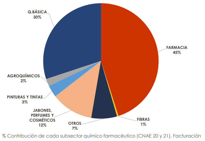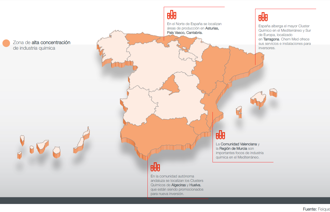 El sector químico se articula en torno a la industria petroquímica y a la industria química de transformación. La primera constituye la química de base, que se lleva a cabo en grandes complejos industriales, por lo general asociados a las refinerías de petróleo (Puertollano, Cartagena, Algeciras, Huelva, Santa Cruz de Tenerife, etc.) Es tributaria de grandes capitales, por lo común extranjeros. La química de transformación fabrica productos de consumo final: caucho para neumáticos, plásticos, colorantes, pinturas, barnices, fibras textiles, perfumes, material fotográfico, fertilizantes, productos farmacéuticos, etc., que se elaboran en establecimientos fabriles de mucho menor tamaño. Estos tienen un alto grado de dispersión espacial, aunque su localización preferente coincida con las regiones más industrializadas del país: Cataluña, Andalucía, Valencia y área metropolitana de Madrid. Este sector obtiene el 13,3% de la producción y genera un empleo directo de 234.200 personas, cifra que supera los 796.000 si contamos los empleos indirectos e inducidos, siendo al mismo tiempo suministradora de materia primas y productos intermedios a otras ramas industriales. Su peso como motor económico de España se traduce en la generación del 5,6% del PIB Nacional y del 4,6% del empleo de España, si sumamos sus efectos indirectos e inducidos y el 13,8% del PIB Industrial (2022). Además, es un sector con relevante apertura al exterior, el segundo en el ámbito industrial con más capacidad exportadora, un 60% de la producción, con una tendencia creciente en los últimos años, con Francia y Alemania como principales mercados.
