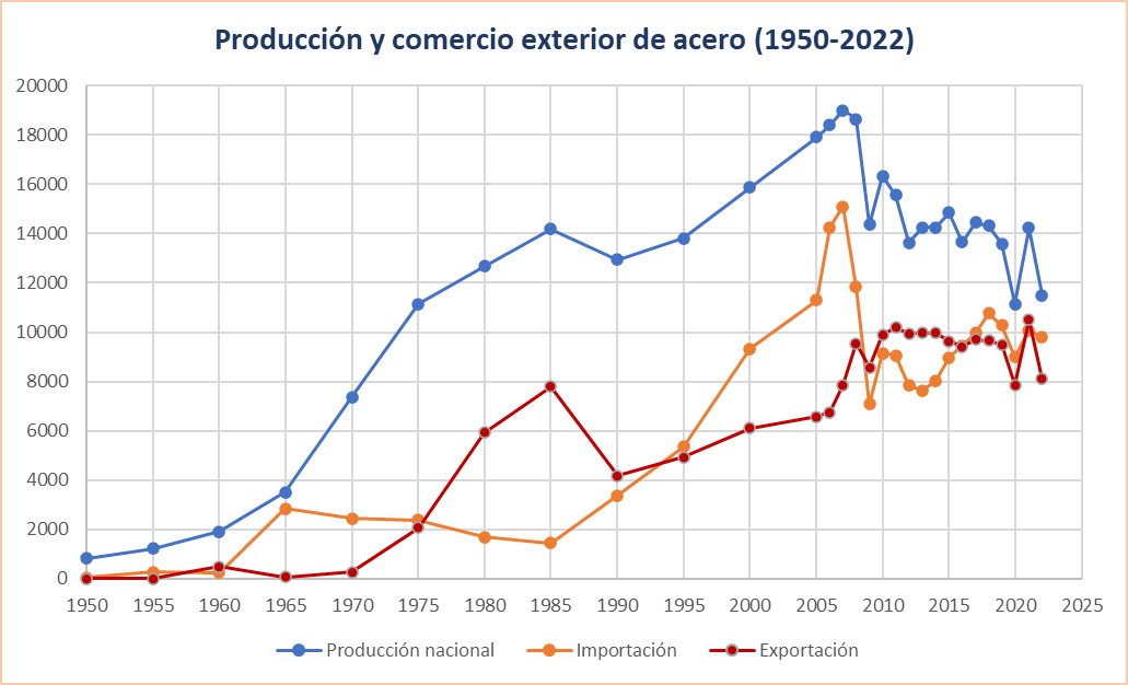 La industria siderúrgica obtiene acero a partir del mineral de hierro en el alto horno; se consolidó en el País Vasco, para luego extenderse al Mediterráneo (Altos Hornos del Mediterráneo) y a Asturias (Ensidesa). Tuvo un gran impulso en las actuaciones llevadas a cabo por el Instituto Nacional de Industria, que construyó grandes acerías, explotadas por empresas públicas. Su sobredimensionamiento con relación a las necesidades españolas fue una de las causas que originaron su crisis, razón por la cual fue necesaria una fuerte reconversión que tuvo importantes repercusiones sociales, por lo que sólo se mantiene en Asturias, donde forma parte de un grupo multinacional que lidera la producción mundial de acero. La siderurgia no integral, en cambio, obtiene acero a partir de la chatarra en horno eléctrico y responde a una estructura empresarial de menor tamaño; radica preferentemente en el País Vasco, aunque su ámbito de implantación se extiende también a Navarra, Asturias y Cataluña. Sus retos son el encarecimiento del hierro y de la energía; la aparición de materiales sustitutivos de los metales (composites, nanomateriales); reducir las emisiones de CO2, e incrementar el valor añadido (personalización, combinación del metal con otros materiales).