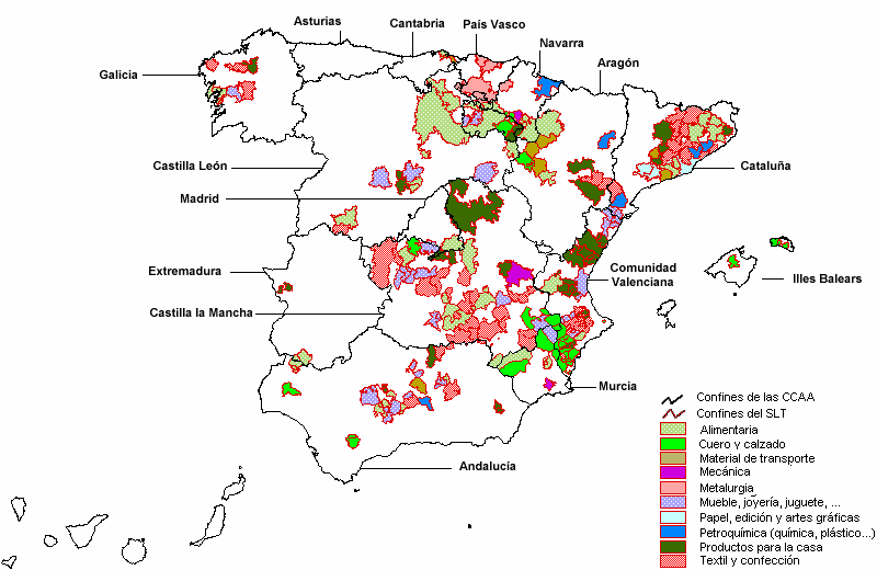 c) Los clusters, distritos industriales, o sistemas productivos locales son espacios industriales formados por redes de pymes, especializadas en el mismo producto o complementarias. Estas empresas combinan la competencia con la colaboración para acceder a la información, a la innovación, o a ciertos servicios, lo que les permite gozar de las mismas ventajas que las concentraciones industriales. Se generan en territorios que ofrecen ventajas competitivas: un tejido de ciudades medianas y pequeñas (que aseguran a las empresas servicios e infraestructuras básicos); conexión con zonas rurales (que aportan producciones y mano de obra flexible); tradición de cooperación empresarial; y apoyo de las instituciones locales. En España existen más de doscientos, extendidos por casi todas las comunidades autónomas, entre las que destacan La Rioja, Cataluña, la Comunidad Valenciana, el País Vasco, y Castilla-La Mancha.