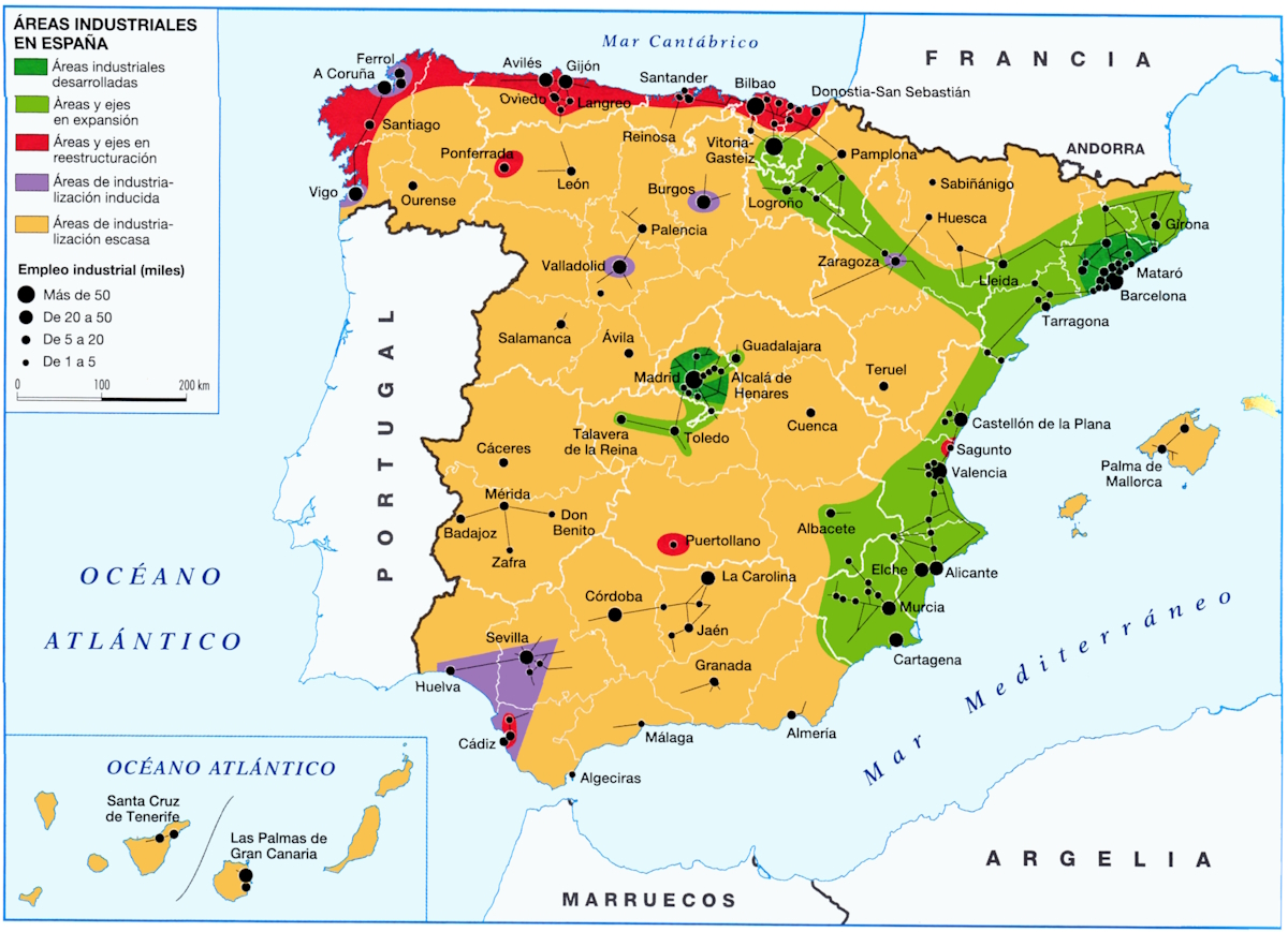La localización de la industria presenta desequilibrios territoriales, pues existen áreas industrializadas con distinto dinamismo-desarrolladas, en expansión y en declive-y áreas de industrialización inducida y escasa.
